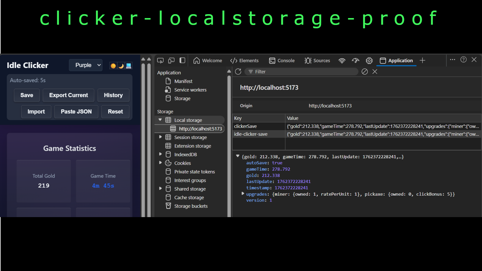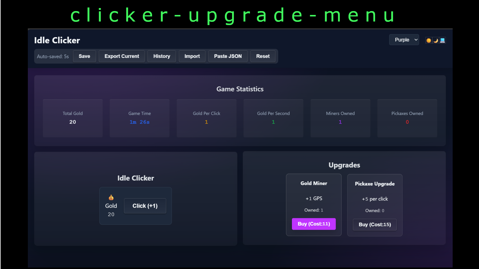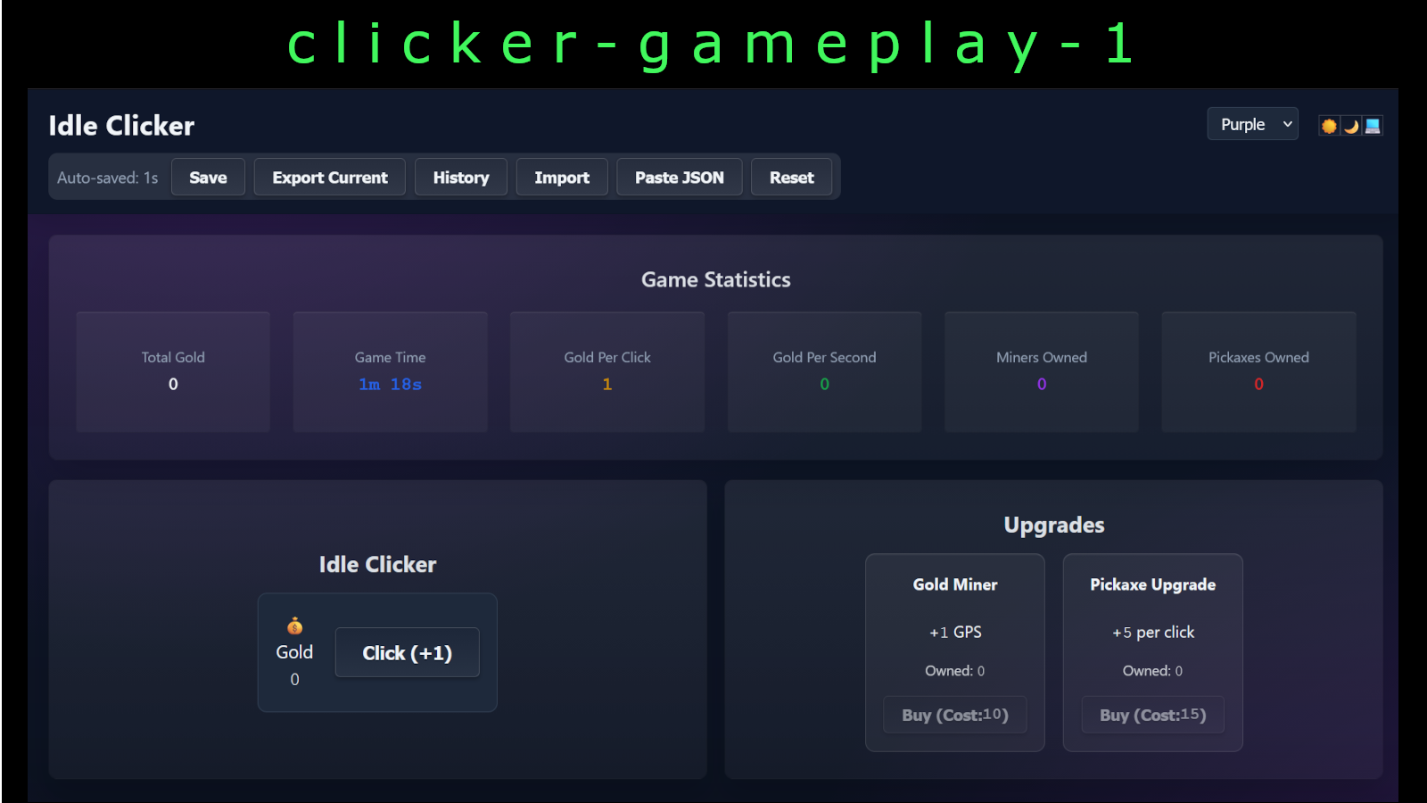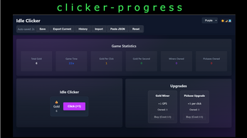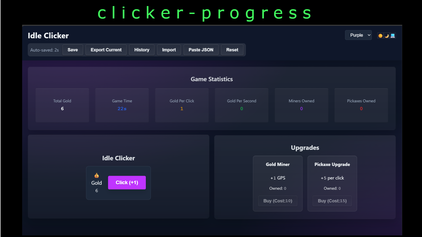 โ Auto Save / Load โ Offline Progress Calculation โ Clicker Logic + Resource Balancing โ Upgrade System + Scaling โ Dark Mode Theme โ Persistent Game State (Zustand + localStorage)